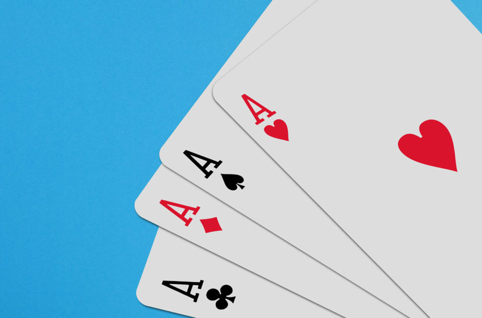 • Close-up of four matching playing cards held in a fan (alt text: “Four of a kind needed to win in Kemps”)
