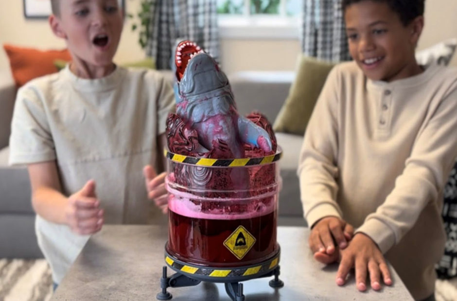 Once hatched, the toy becomes a fully interactive creature featuring light-up eyes, motorized chomping action, flexible rubber skin, and an internal spring mechanism that allows the shark to compress and hatch again. That reset feature is key, because it turns the hatching moment into something kids can repeat rather than a one-time gimmick.